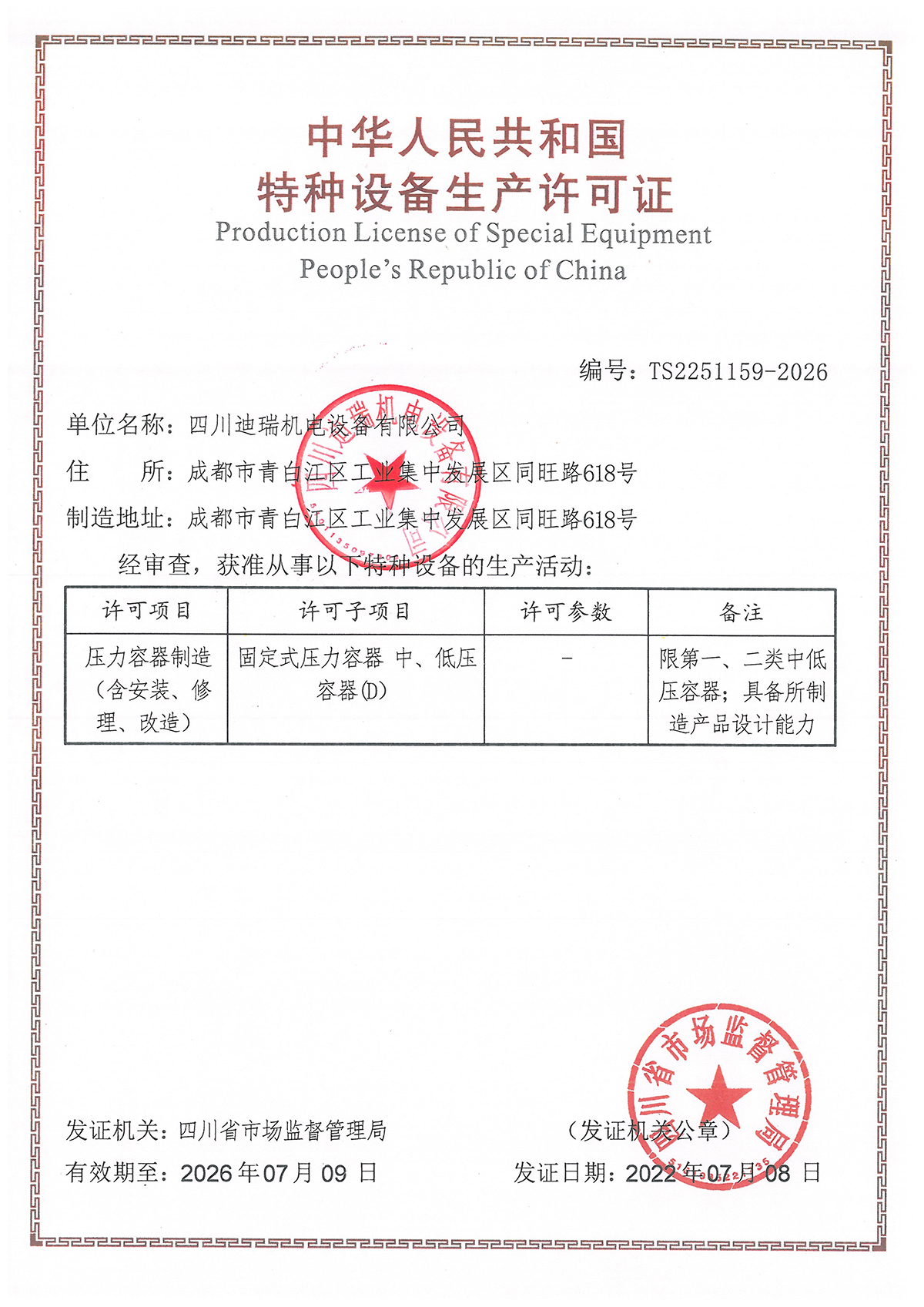 壓力容器設(shè)計(jì)/制造證書