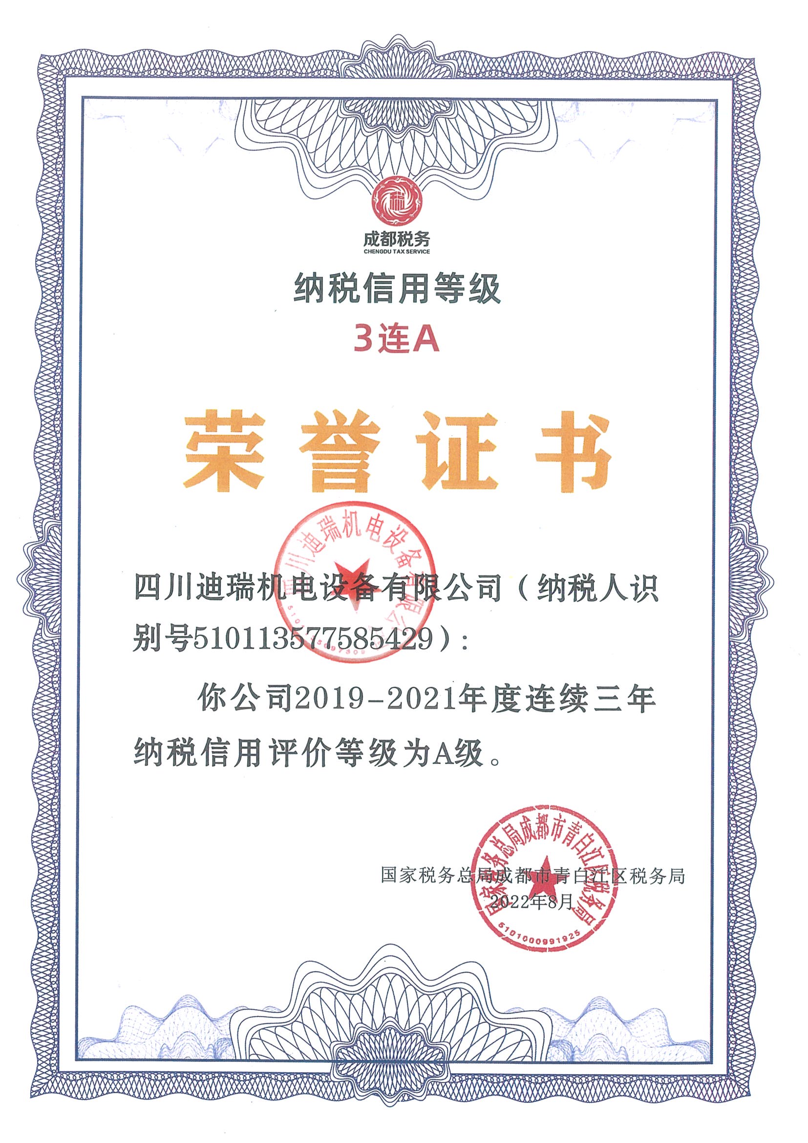 納稅3A等級證書